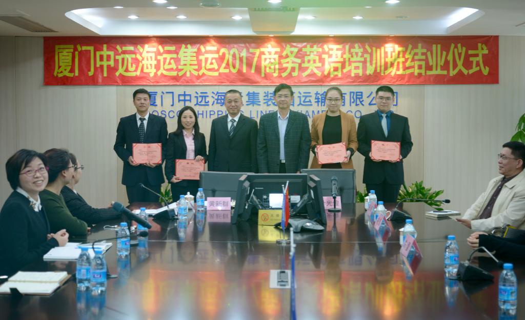 12月25日,中远海运商务英语培训班结业仪式在厦门中远海运集装箱运输有限公司会议室举行。厦门中远海运集装箱运输有限公司党委书记黄新群、诚毅学院院长叶光煌出席结业仪式并向优秀学员颁发优秀学员证书,厦门中远海运人力资源部领导及学生代表、诚毅学院对外交流合作部相关人员参加结业仪式。