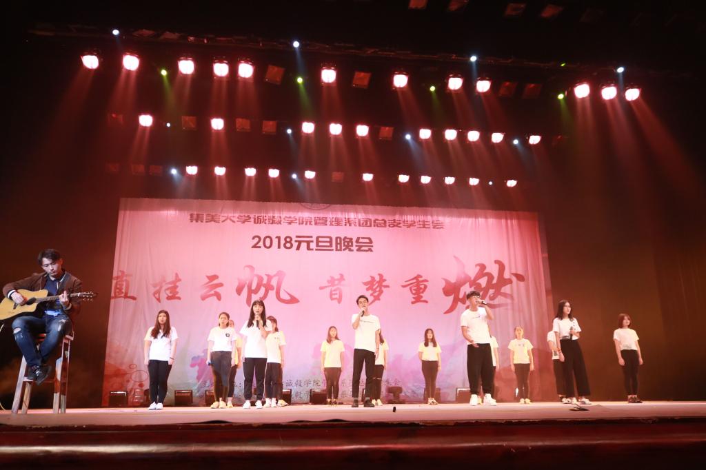 晚会由迷路鲸鱼乐队带来的歌曲《摇摆》与原创歌曲《她不愿意》震撼开场,迎来第一篇章“流年似水,岁月如歌”。诚毅宝贝带来的舞蹈《Control》为观众呈现了丰盛的视听盛宴。来自工程1792谢周和院十佳歌手饶津珲的《你要的爱》赢得台下阵阵掌声。云跃剧社倾情表演的情景剧《我叫安德烈》引起了观众们的共鸣,场下笑声不断。在互动环节中,台下的同学们积极参与其中。sup街舞工作室带来的《肌肉爆震》,打开了新的篇章——“青春诚风,毅路有你”。随后,伴随着轻扬的音乐,由管理系礼模队带来的T台秀展现了在校学生独特的青春与活力。紧接着由工程12专业的徐润丰、许逸文、杨鑫喜三位同学的嘻哈串烧更是燃爆全场。“毅魂棍道”带来精彩的武术表演《棍武春秋》更是带领全场观众领略另一种风采。一曲优美的舞蹈拉开了第三篇章“展望未来,翘首以待”的序幕,由墨缘书法协会带来的书法表演给我们展示了中华文化的独特魅力。厦门UK团队带来的花式篮球和平衡车更是把全场气氛推向高潮。紧接着新生代表合唱《梦一场》、《诚毅南山南》以及诚毅学院管乐团带来的压轴演奏,更是掌声如潮。
