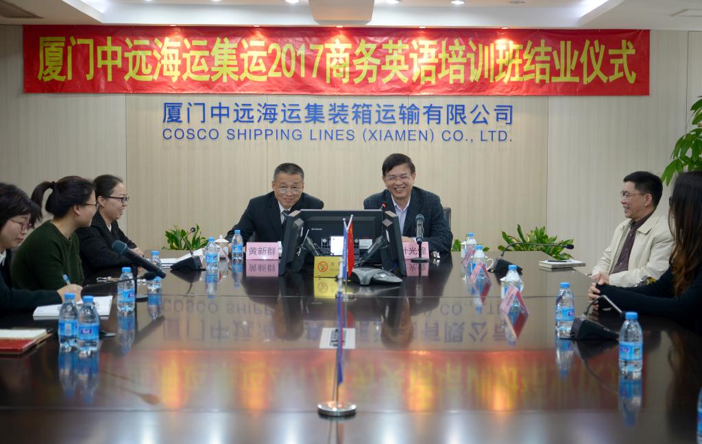 12月25日,中远海运商务英语培训班结业仪式在厦门中远海运集装箱运输有限公司会议室举行。厦门中远海运集装箱运输有限公司党委书记黄新群、诚毅学院院长叶光煌出席结业仪式并向优秀学员颁发优秀学员证书,厦门中远海运人力资源部领导及学生代表、诚毅学院对外交流合作部相关人员参加结业仪式。
