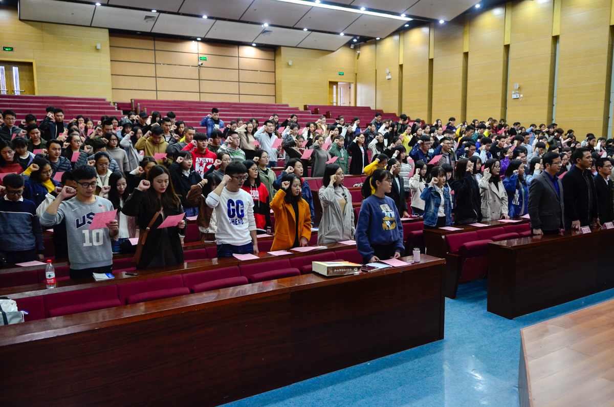 宣誓仪式上,连志崧带领全体新党员面向党旗,庄严宣誓。来自商船系的陈腾腾、机械工程系的吴瑞清和经济系的林柠柠作为新党员代表交流发言。